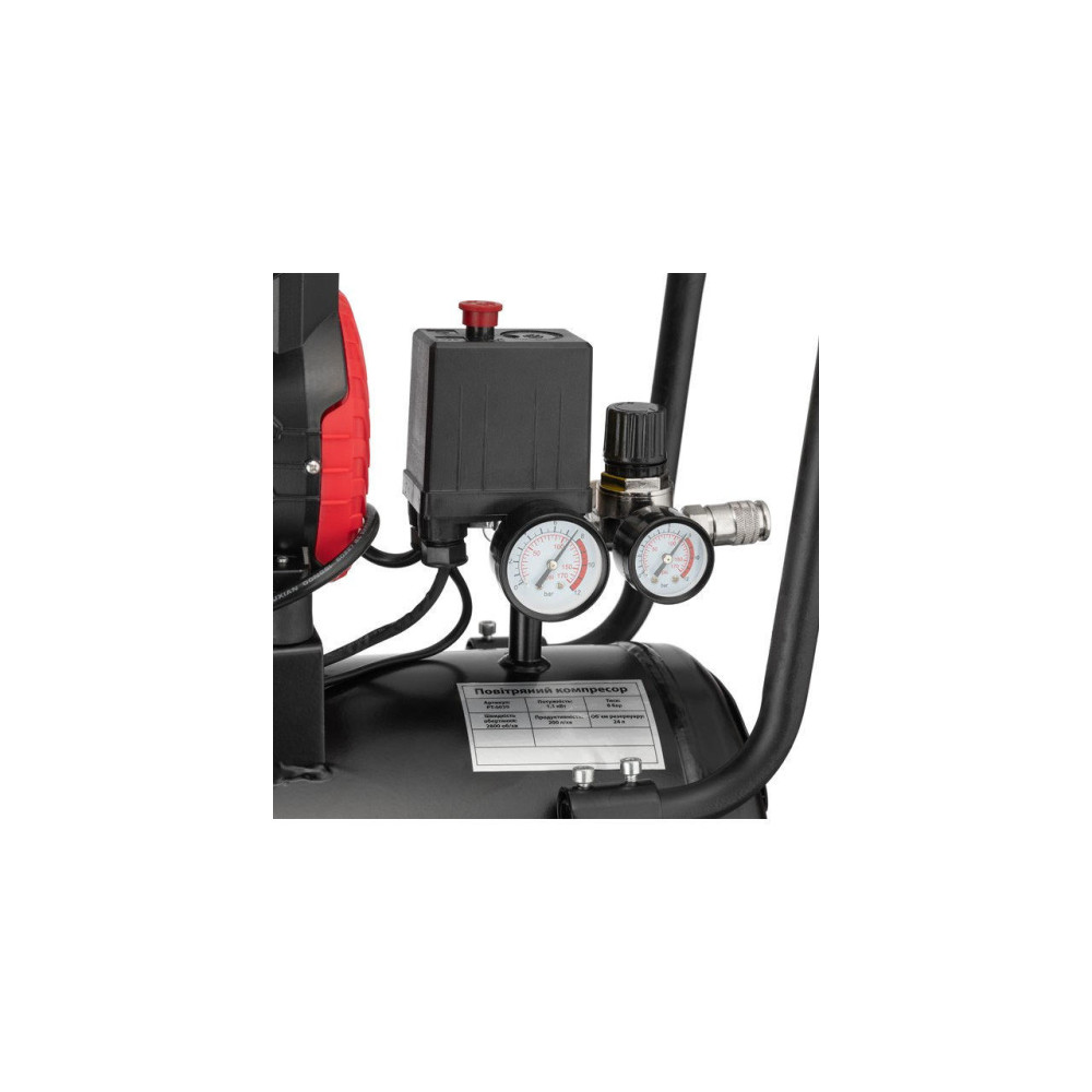 Повітряний безмасляний поршневий компресор PT-0029 дозволяє отримати чистий стиснене повітря без домішок масла. Призначений для побутового та професійного використання. Широко застосовується в медицині, в стоматологічній галузі, в харчовій промисловості, в домашніх умовах і т.д. Потужність компресора 1100 Вт забезпечує швидку накачування повітря в 24-х літровий ресивер, до робочого тиску 8 атмосфер. Продуктивність компресора безмасляного PT-0029 складає 200 л / хв. На ресівері встановлений блок автоматики компресора (прессостат), регулятор тиску, запобіжний клапан, два манометра, а також захист від стрибків напруги мережі, короткого замикання і перегріву електродвигуна. Нижня частина ресивера має клапан для зливу конденсату, який може періодично утворюватися в процесі роботи. Не забувайте зливати конденсат з ресивера, в іншому випадку це може привести до корозії і потрапляння великої кількості вологи в повітря. Відмінною рисою безмасляного компресора є робота без використання мастила поршневої системи. Вам не потрібно кожен раз контролювати рівень масла, в результаті компресор дуже простий в обслуговуванні. Для зручного транспортування компресор оснащений двома колесами і ручкою. Особливості: Продуктивність 200 л / хв Мідна оплетка двигуна Зручний контроль тиску Відсутність домішок масла в стислому повітрі регулюється вихідний тиск Захист від стрибків напруги і перегріву Простий у використанні Стійкі колеса для транспортування і зберігання Рівень шуму: 68 дБ; Кількість циліндрів: 2; Напруга живлення: 220 В; Потужність: 1,1 кВт; Робочий тиск: 8 атм; Обсяг ресивера: 24 л; Продуктивність: 200 л / хв; Тип двигуна: асинхронний, однофазний; Тип приводу: коаксіальний
