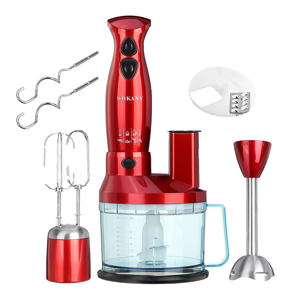 Кухонний комбайн Sokany SM-5011-7 - це незамінний помічник на вашій кухні, який містить у собі блендер, міксер, соковитискач і м'ясорубку. Цей набір забезпечить широкі можливості для приготування різних страв і напоїв.Кухонний комбайн оснащений двома режимами швидкості, що дає змогу вибрати оптимальний режим залежно від потреб. Ви зможете легко регулювати швидкість змішування і домагатися бажаної консистенції.З потужністю 600 Вт блендер забезпечує достатню енергію для швидкого та ефективного подрібнення або змішування різних інгредієнтів. Ви зможете легко приготувати смузі, пюре, соуси та інші кулінарні шедеври.У комплекті йде блендер з гострим лезом, подрібнювач об'ємом 700 мл з лезами з нержавіючої сталі, гаки для тістоміса і вінчик. Знімні насадки полегшують використання та чищення.Занурювальна частина виготовлена з нержавіючої сталі, що забезпечує її міцність і довговічність.Комбайн також має низький рівень шуму, що робить його більш зручним у використанні.Sokany SM-5011-7 також має захист від бризок, що запобігає можливим розбризкуванням і розливам під час роботи.Компактний дизайн робить цей набір зручним і легким у зберіганні та використанні. Він займає мінімум місця на вашій кухні, але при цьому збереже всі необхідні функції для приготування різноманітних страв.Кухонний комбайн SM-5011-7 - це надійний і універсальний помічник на вашій кухні, який допоможе вам швидко і легко приготувати різноманітні страви та напої.Translated with www.DeepL.com/Translator (free version)